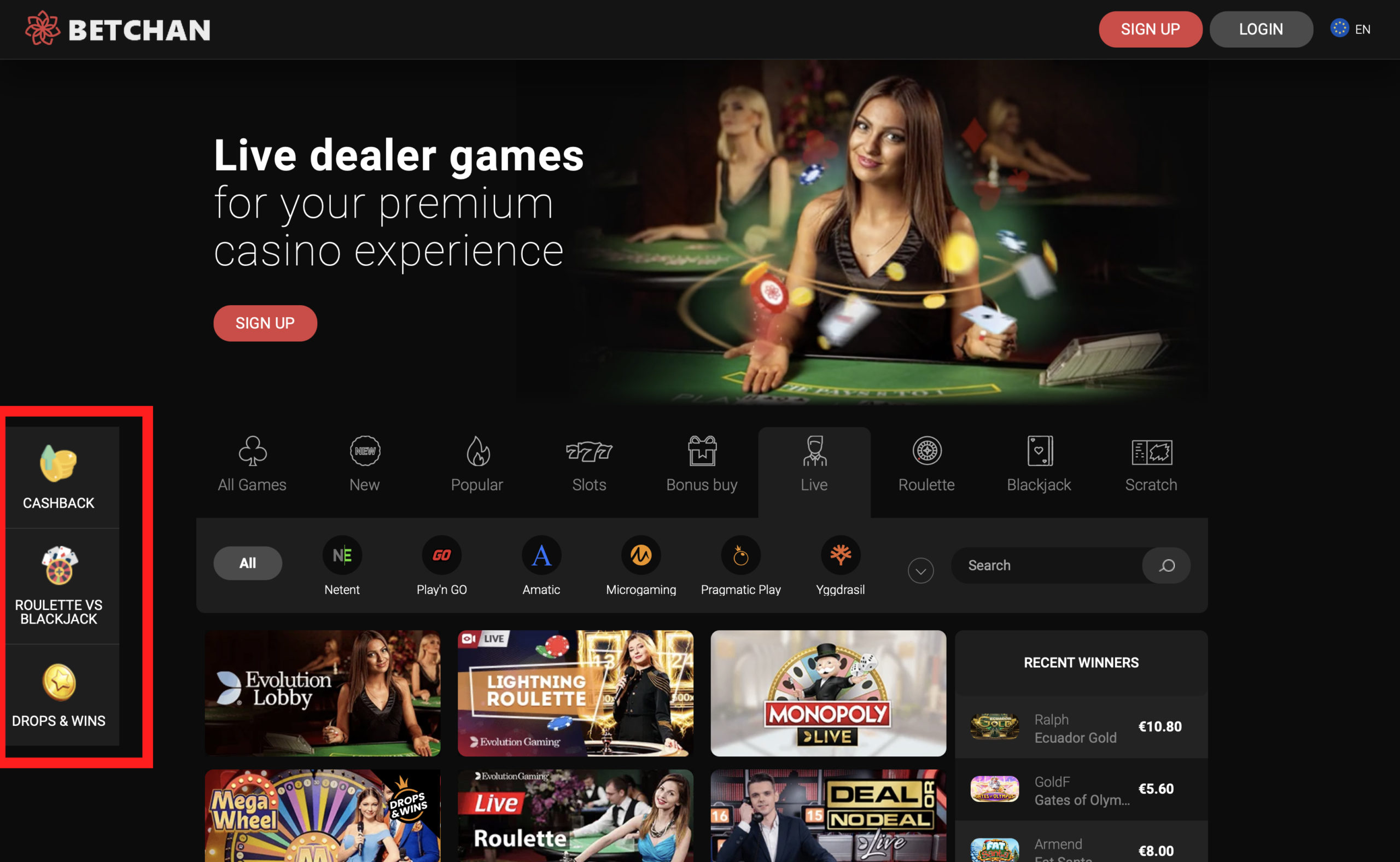 BetChan positioniert den Einstieg klar über seine starke Spielauswahl, bekannte Provider wie Pragmatic Play, NetEnt und Evolution sowie eine elegante Live-Casino-Präsentation. Statt leeren Werbeversprechen steht hier das Gesamtpaket im Vordergrund: professionelle Oberfläche, solide Zahlungsvielfalt mit Visa, Mastercard, Trustly und Paysafecard sowie ein Markenauftritt, der vor allem Spieler anspricht, die Wert auf echtes Casino-Flair in dunkler Premium-Optik legen.